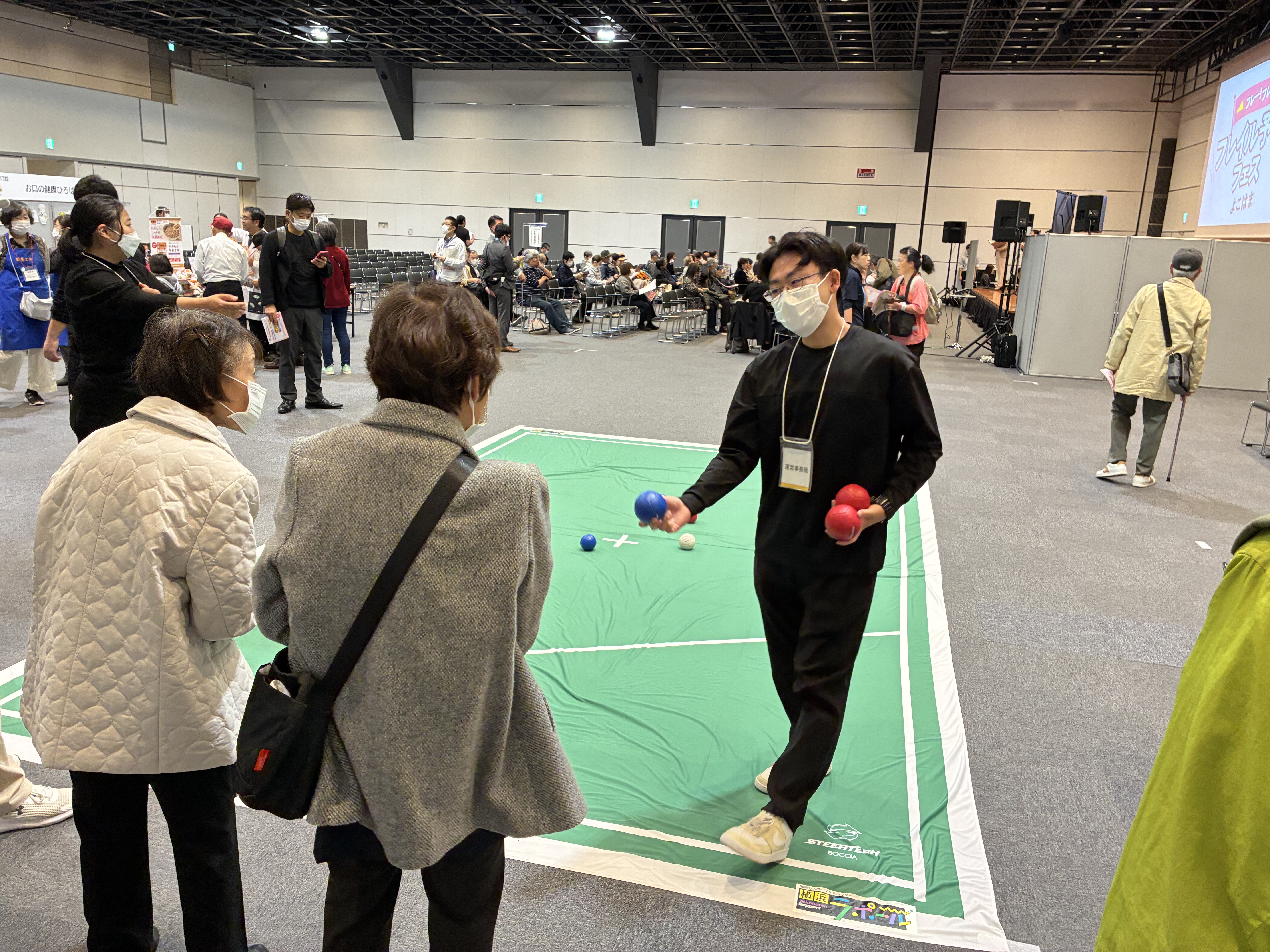 撮影した直立姿勢から身体の歪みや筋力バランスがチェックできる姿勢測定や、誰でも楽しめるスポーツのボッチャの体験ブースがありました。