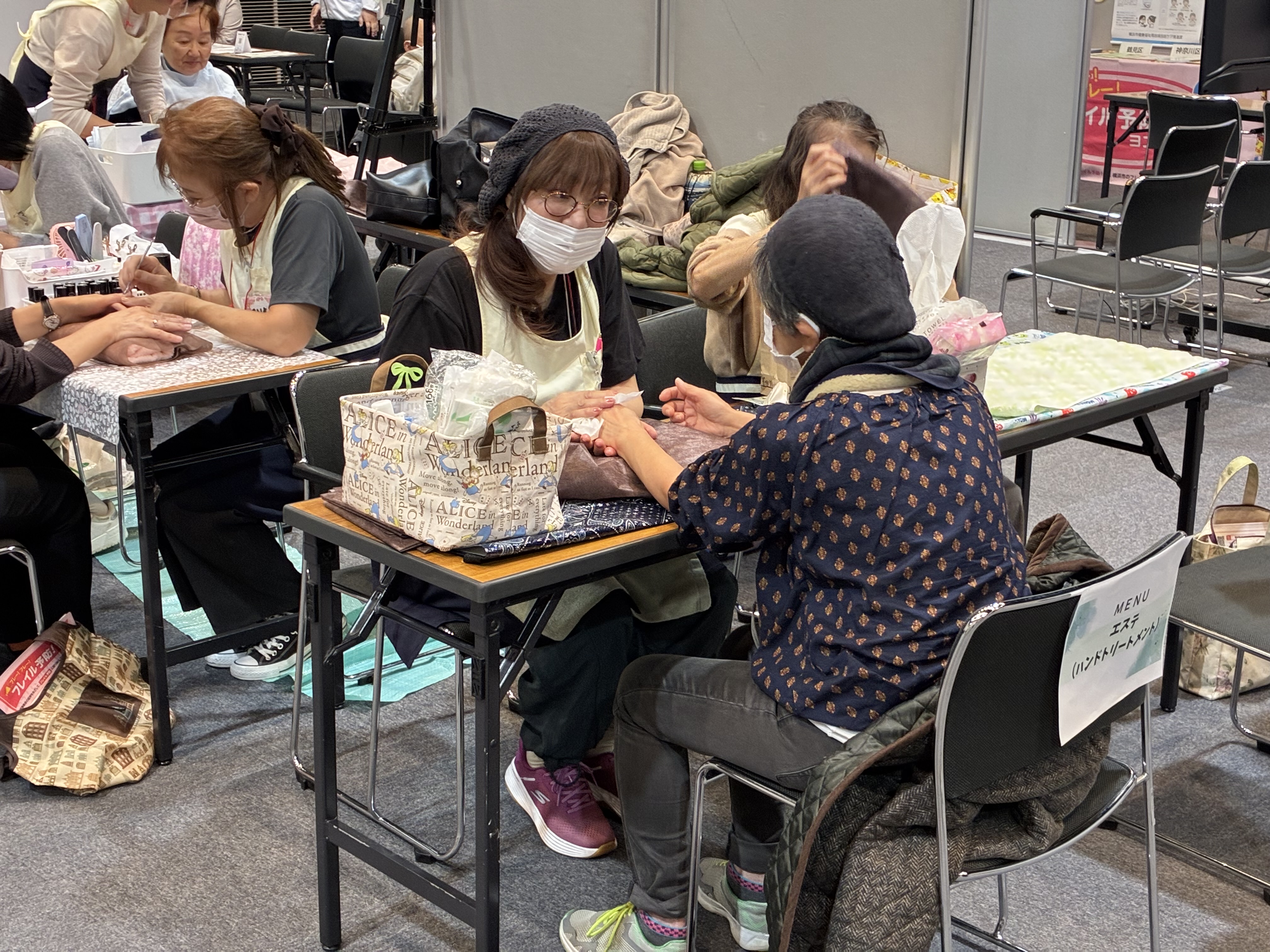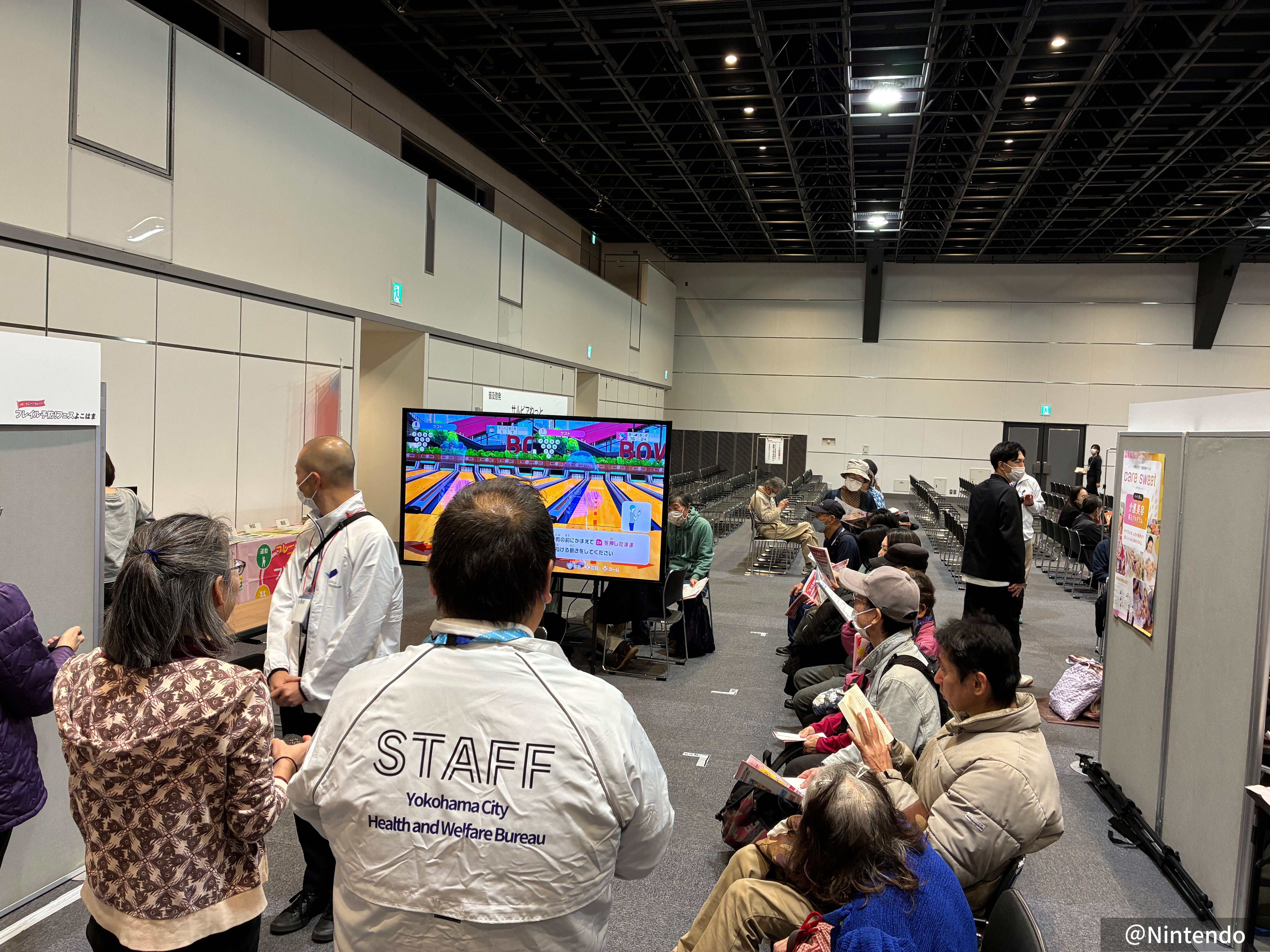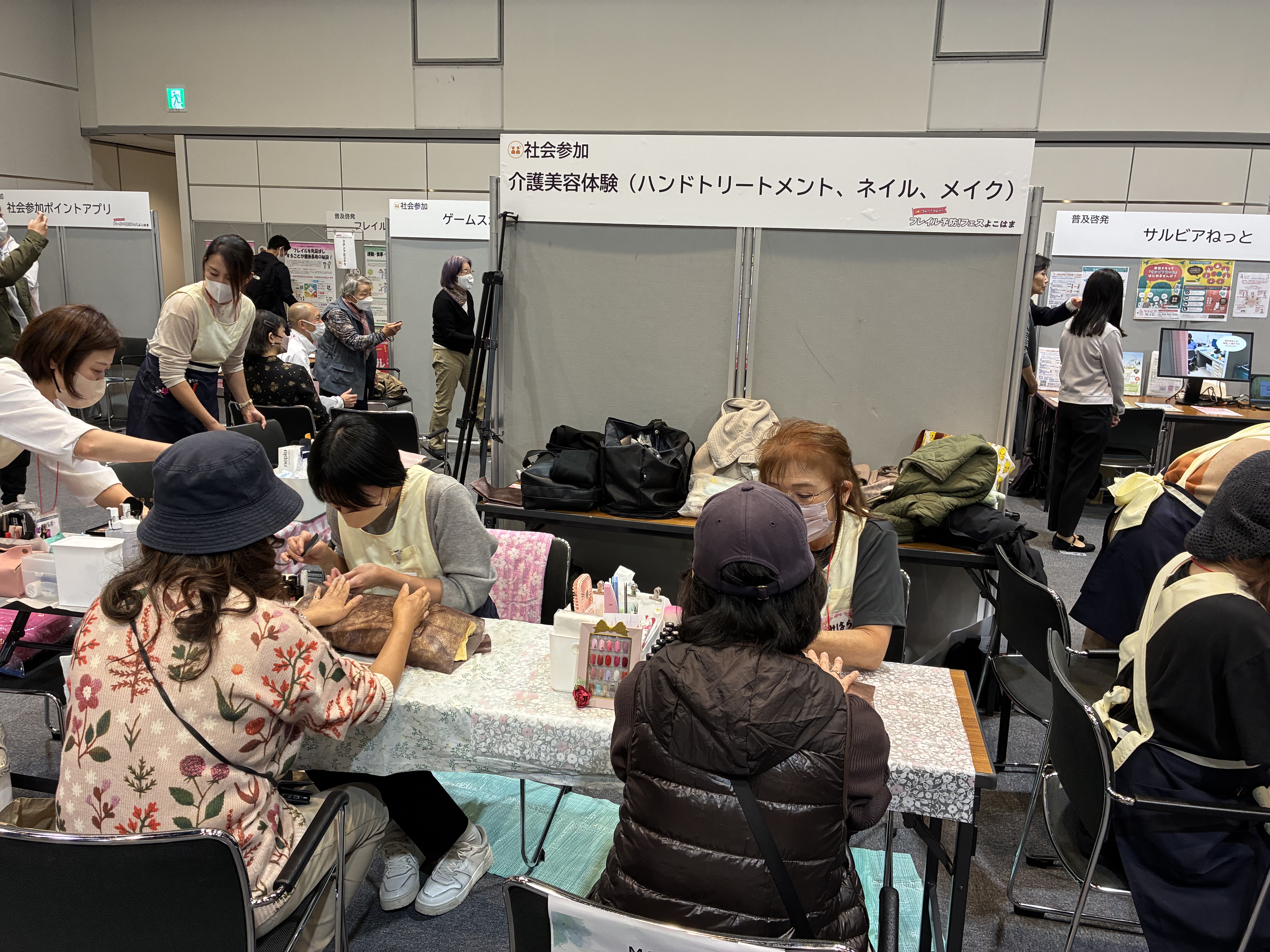 社会参加のコーナーは参加者同士が楽しく交流できるゲーム機を利用したボウリング体験、きれいになることで気持ちが前向きになって外出したくなるネイルなどの美容体験、横浜市で実施する社会参加ポイントアプリの登録支援をしていました。